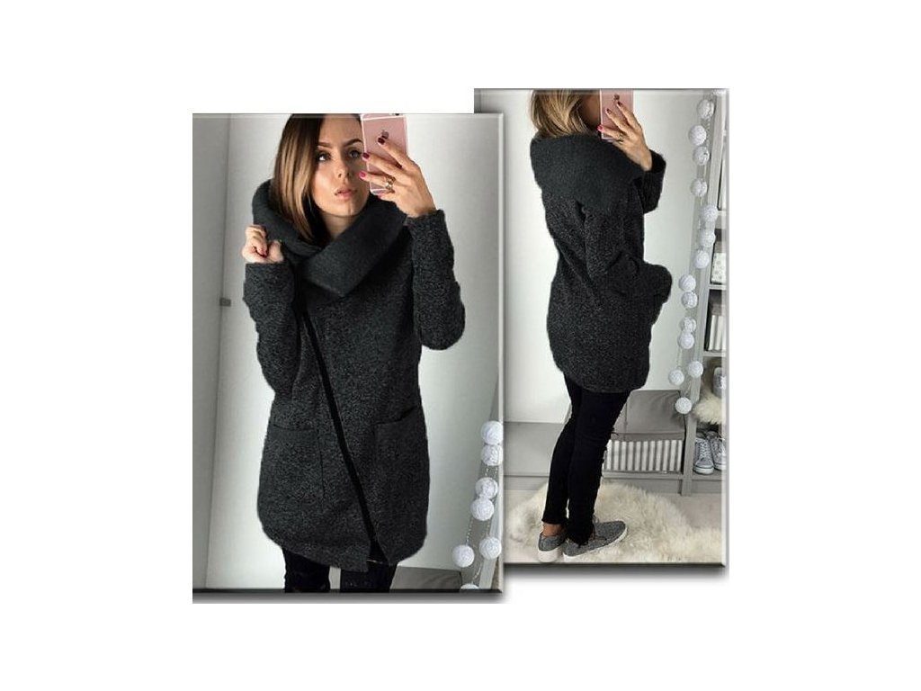Teplá mikina se širokým límcem, který vás zahřeje kolem krku. Mikina má atypické a zajímavé šikmé zapínání.