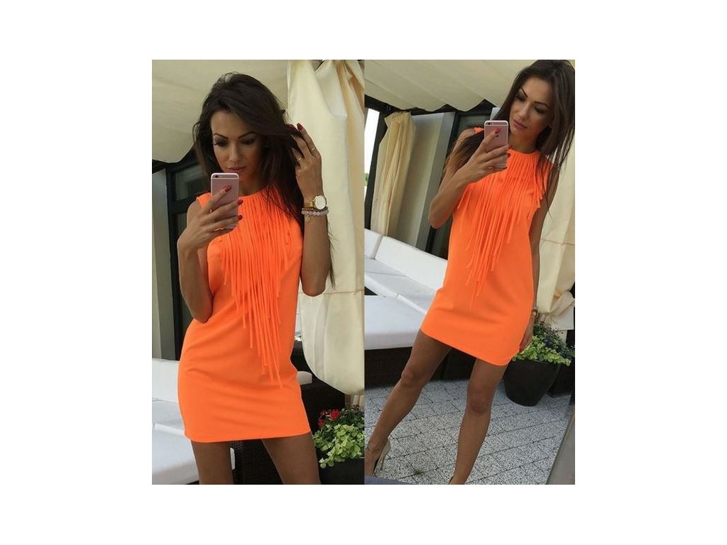 Neonové mini šaty s třásněmi mají ideální střih, který bude krásně kopírovat Vaše křivky. Výstřih zdobený třásněmi si jistě zamilujete.