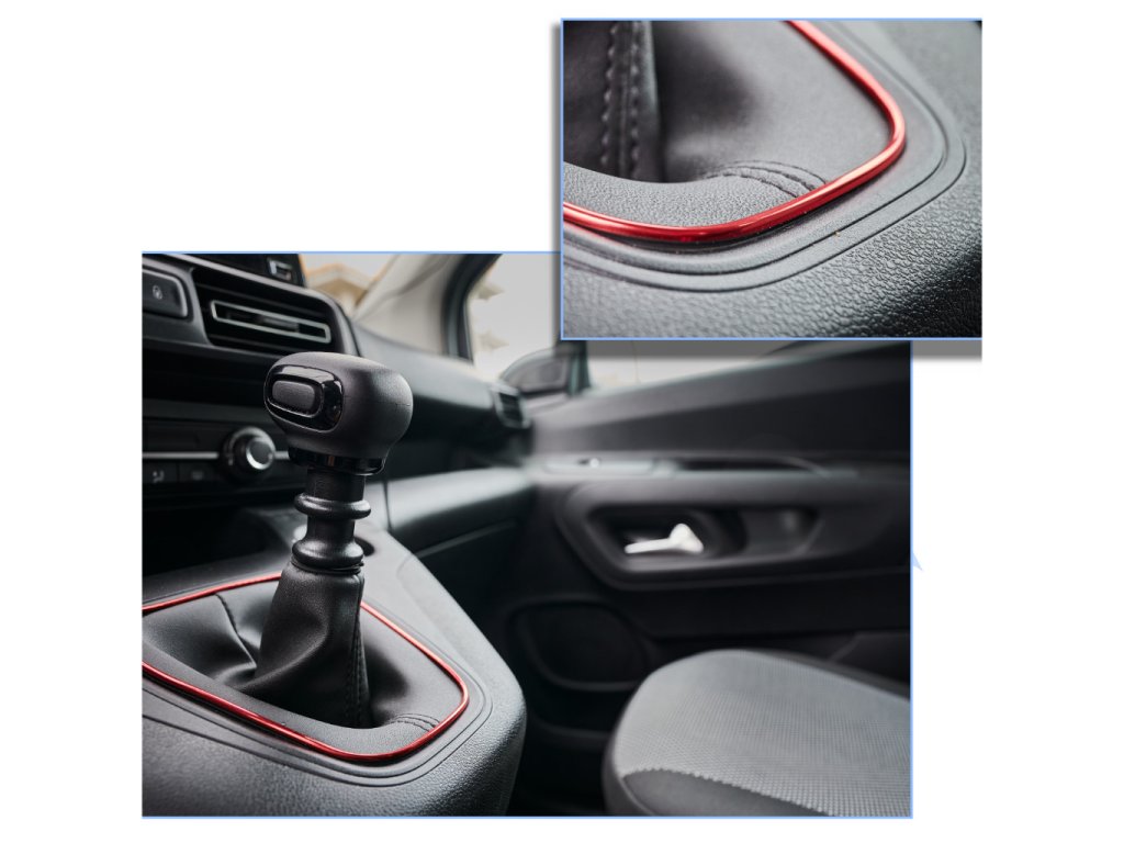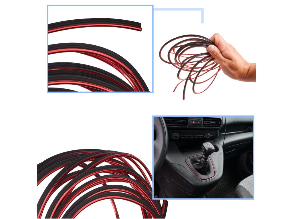 Kovové obložení pro dekoraci interiéru vozu z pružného plastu. Čalounění je určeno k zalisování do spár mezi čalounickými prvky. Délka pásu: cca 5 m.