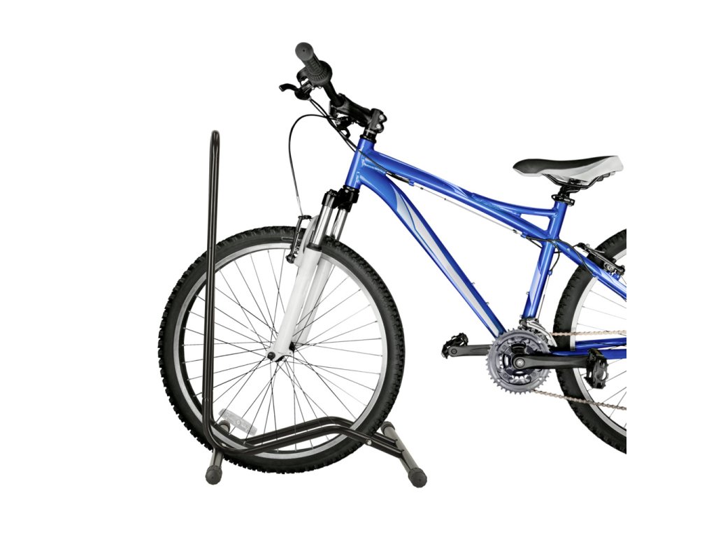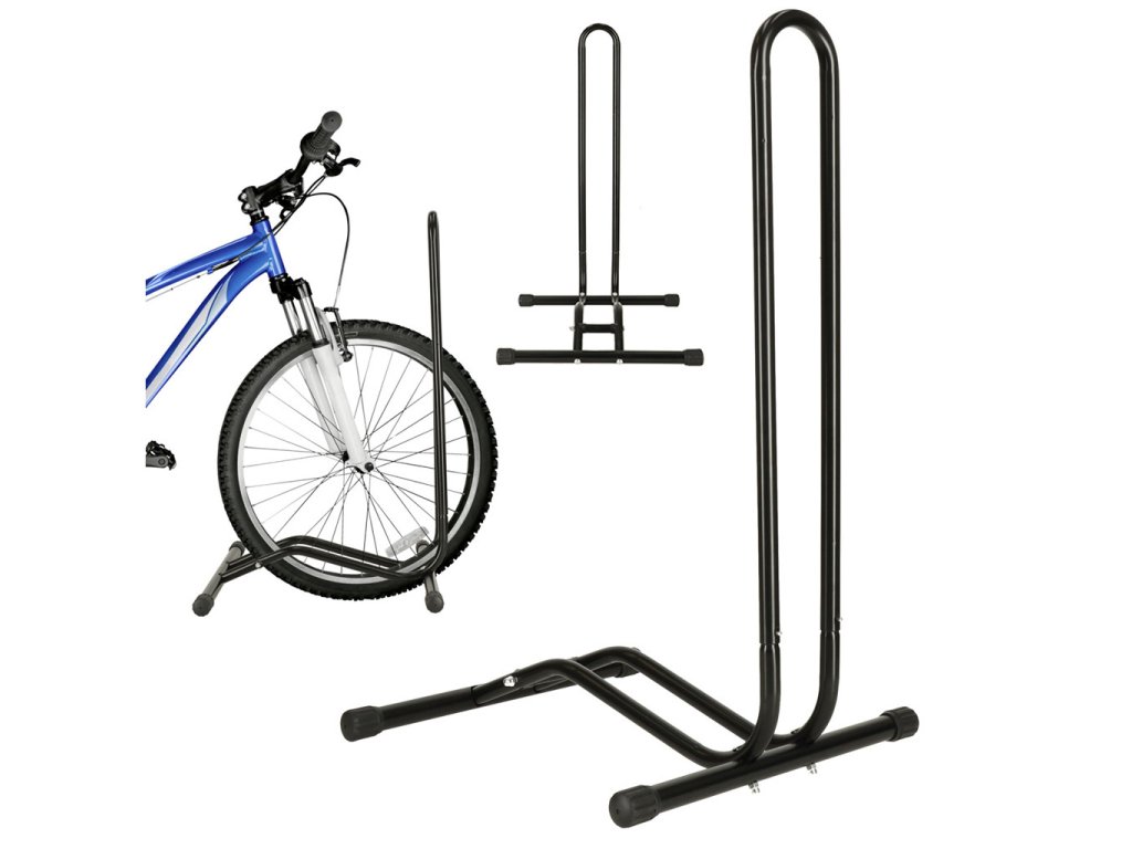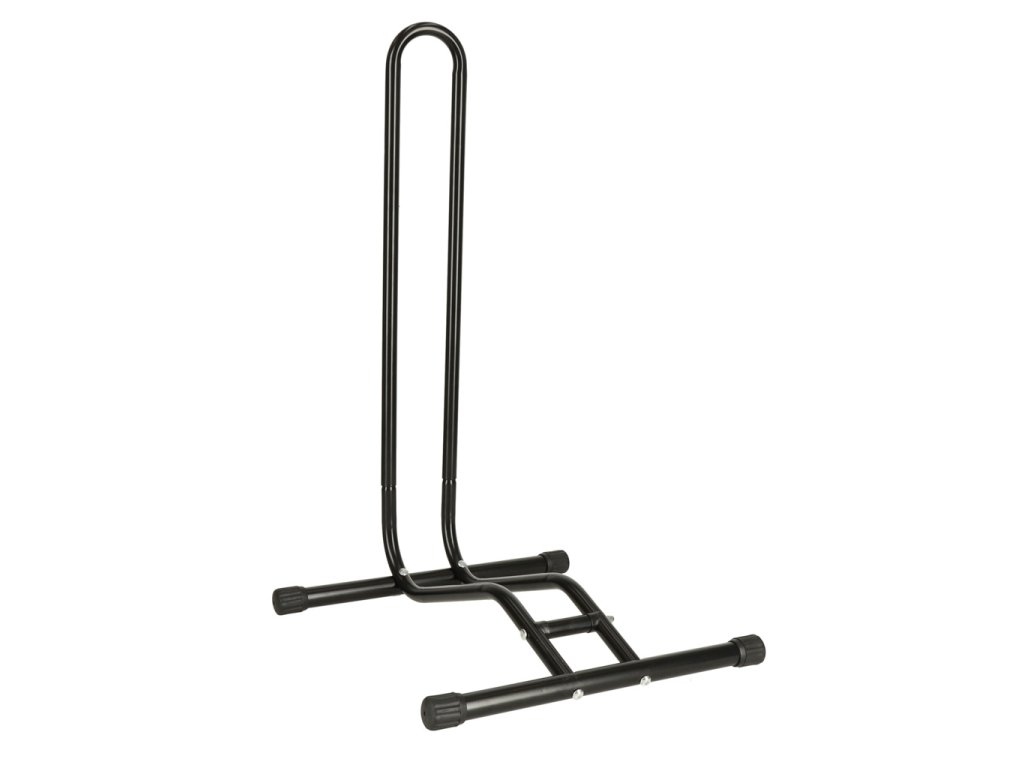 Ocelový stojan pro stabilní umístění jízdního kola za přední nebo zadní kolo. Vhodný pro kola s maximální šířkou pneumatik 65 cm a průměrem 16-27,5". Rozměry: 41 cm x 43,5 cm x 73 cm.