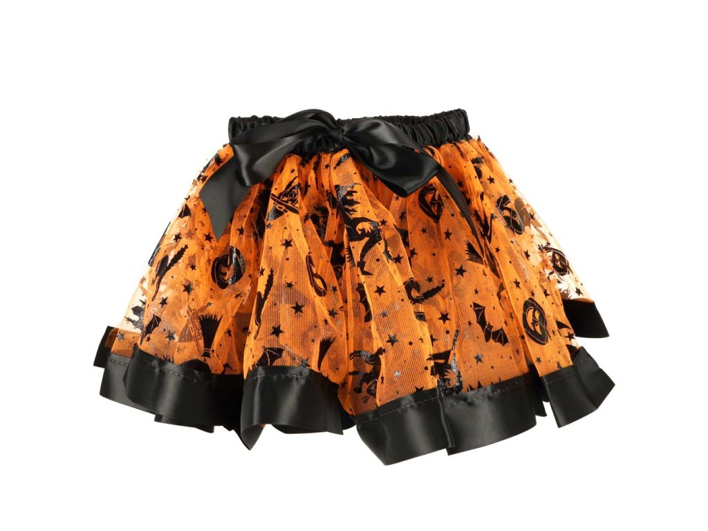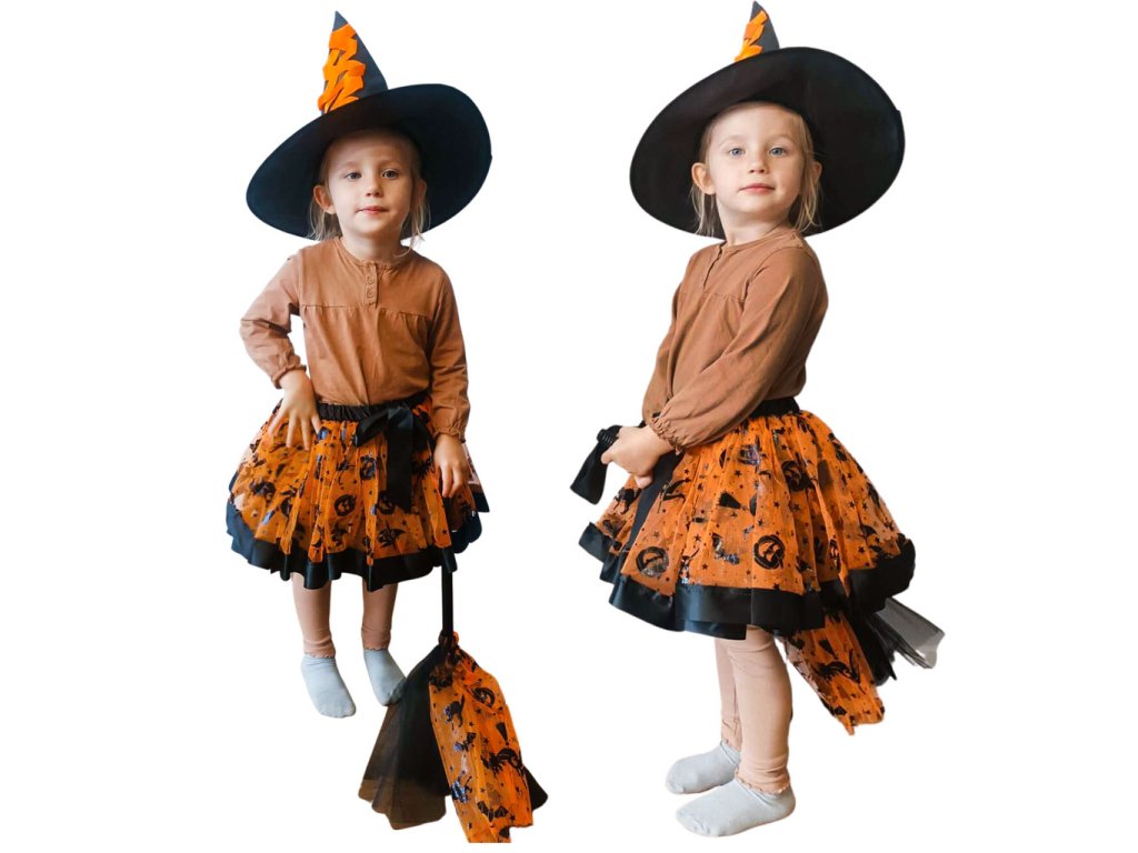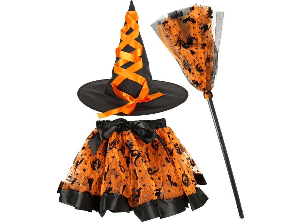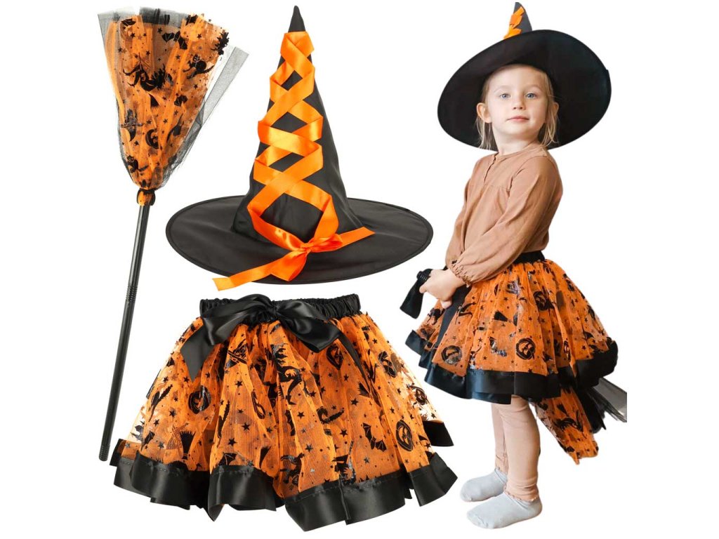 Kostým čarodějnice - ideální na maškarní ples, tematickou party nebo Halloween. Obsahuje tylovou sukni, klobouk a koště. Kostým má oranžové akcenty. Materiál: polyester, bavlna, plast. Šířka sukně: Šířka sukně: 23-42 cm.