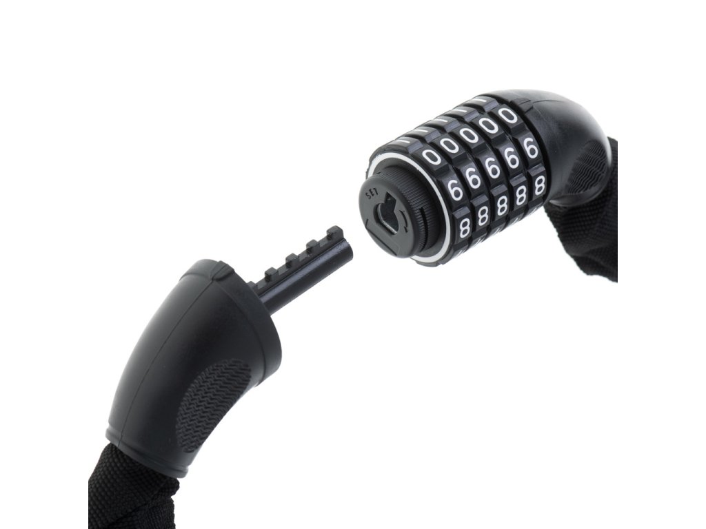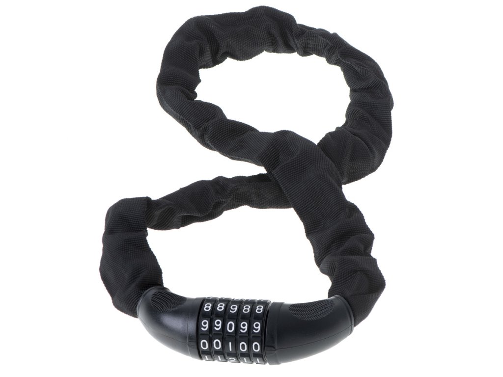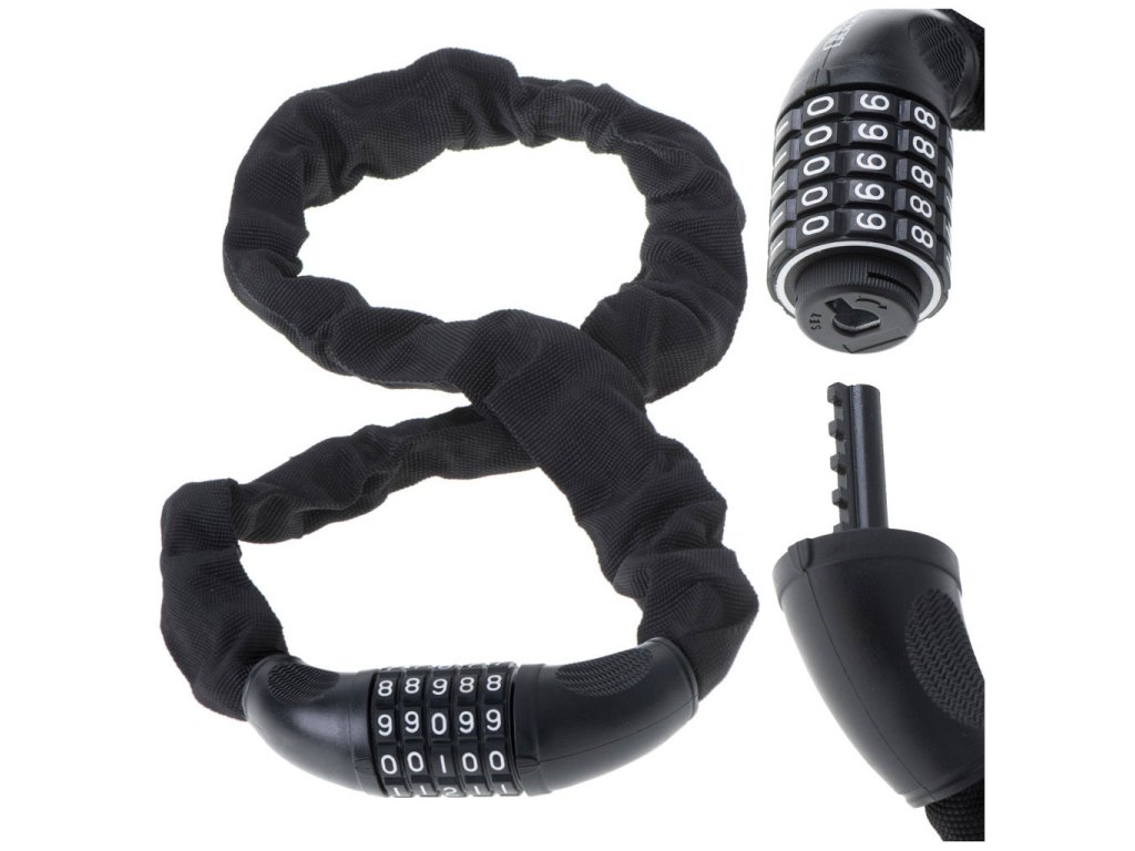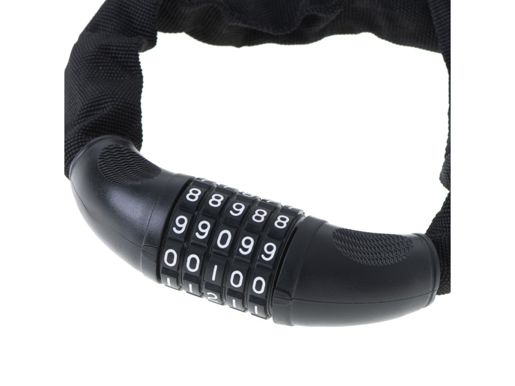 Zámek na kolo s 5místným kódem - vynikající ochrana proti krádeži. Kvalitní zpracování zaručuje vysokou ochranu. Materiál: kovový řetízek potažený materiálem, kovovo-plastové zapínání. Délka řetězu: 100 cm.