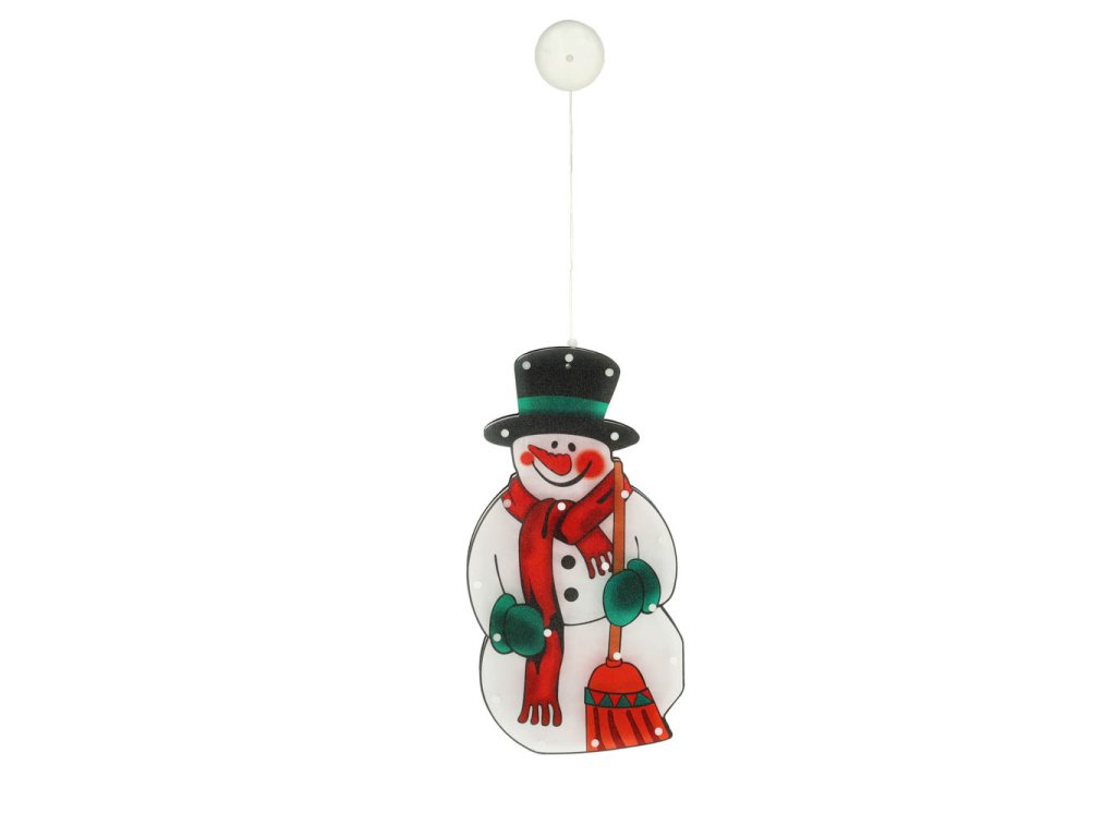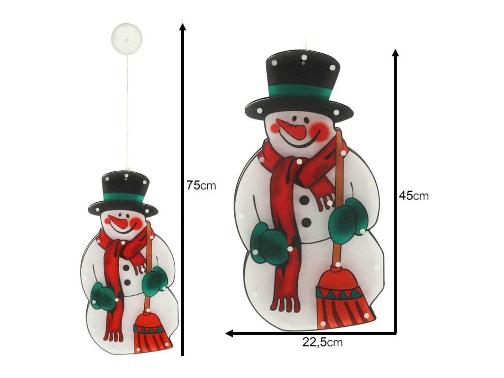 Fantastická vánoční dekorace ve tvaru sněhuláka s LED světýlky. Přinese kouzlo Vánoc. Bude se krásně vyjímat ve výloze. Napájení: 3 baterie AAA. Upevnění: pomocí přísavky. Celková délka: 75 cm. Rozměry sněhuláka: Rozměry: 22,6 cm x 45 cm.