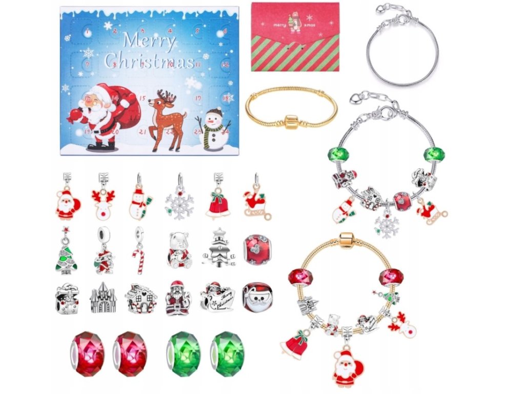 Zažijte radost ze svátků s tímto nádherným vánočním adventním kalendářem. Adventní kalendář, oblíbená vánoční tradice, je nepřehlédnutelným artiklem. Umožňuje dětem netrpělivě odpočítávat čas do Vánoc a za každými dvířky odhalovat úchvatná překvapení, která přinášejí radost a očekávání svátků. Vánoční adventní kalendář, který obsahuje 22 korálků s přívěsky a 2 náramkové řetízky, což umožňuje vytvořit dva okouzlující vánoční náramky.