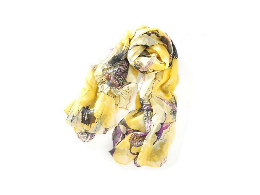 Šátek FLOWERS je obdelníkového tvaru. Můžete ho uvázat kolem krku nebo přehodit přes ramena.