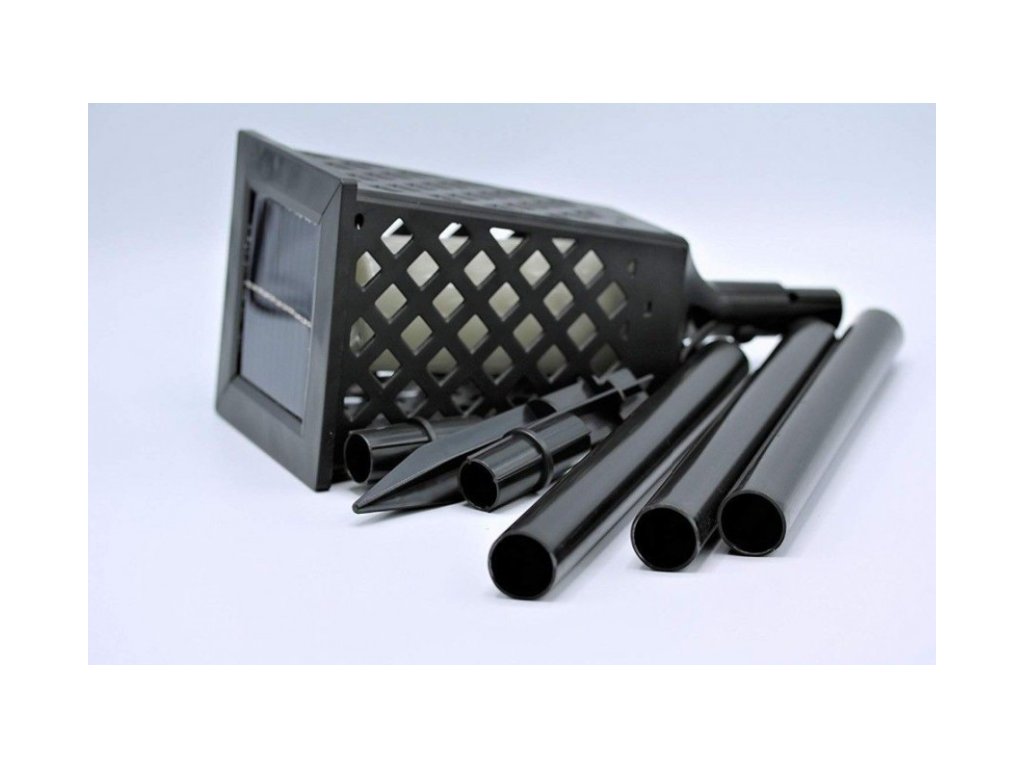 Balení obsahuje: Lampu s žárovkou a solárním panelem, 3 dlouhé tyčky, 2 spojovací krátké tyčky a 1 kolík do země.