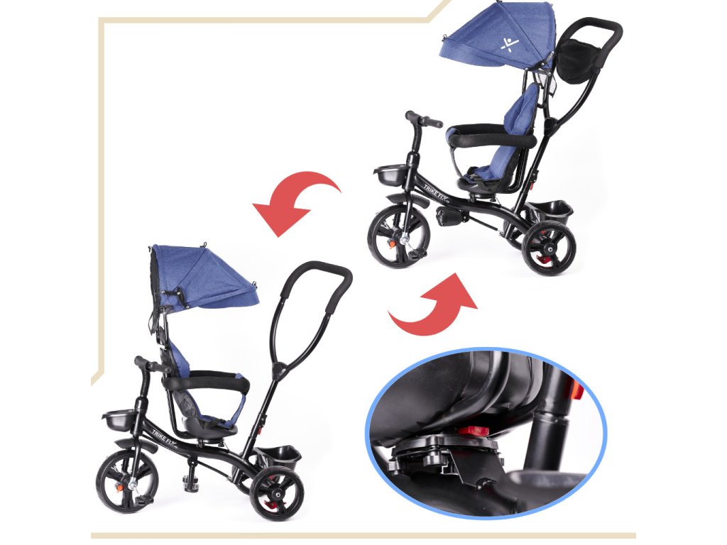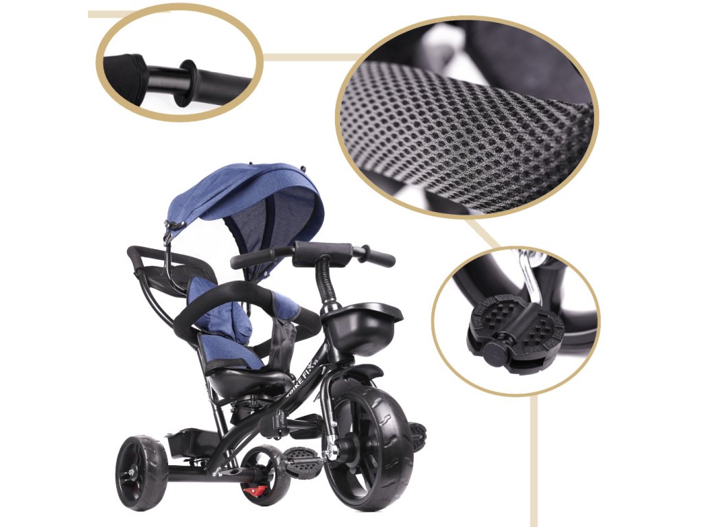 Dětská tříkolka s košíkem. Má otočné sedadlo, výsuvnou tyč a zvonek. Třístupňová síťovaná stříška chrání dítě před sluncem. Ve složeném stavu zabírá velmi málo místa. Robustní zpracování zaručuje bezpečnost. Barva: tmavě modrá.